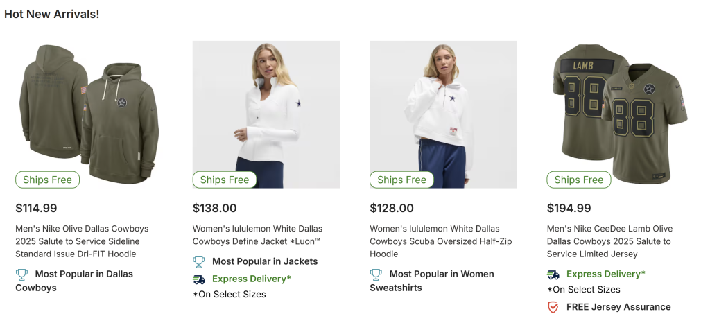 When you buy from shop.dallascowboys.com, you know you’re getting officially licensed Cowboys merchandise — not knockoffs. Jerseys, hoodies, and accessories all come directly from the team’s Pro Shop. That includes big-name styles (Dak Prescott, CeeDee Lamb, Micah Parsons) and special collections. Dallas Cowboys Official Online Store+1